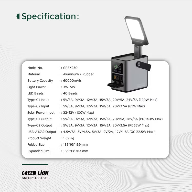 Green Lion Energy Max 60000mAh Power Station 230W – High-Capacity Portable Power Station (Grey)